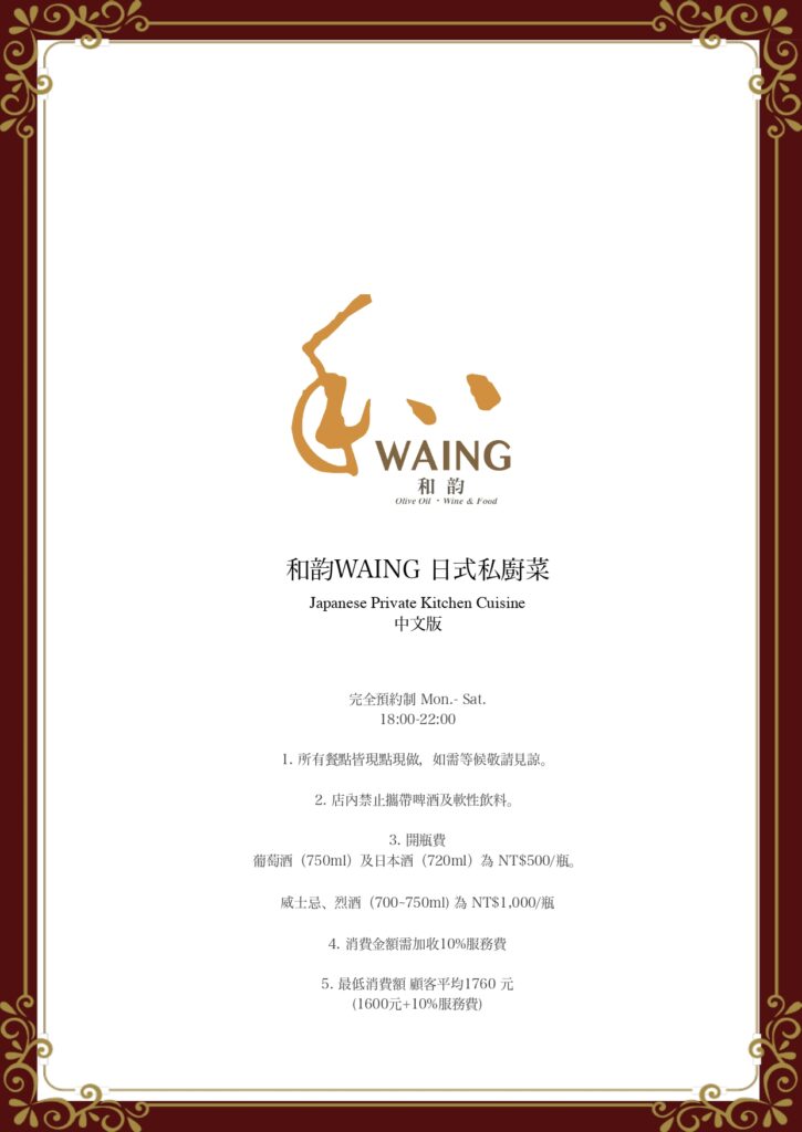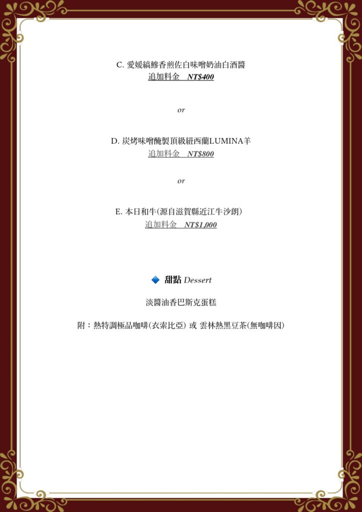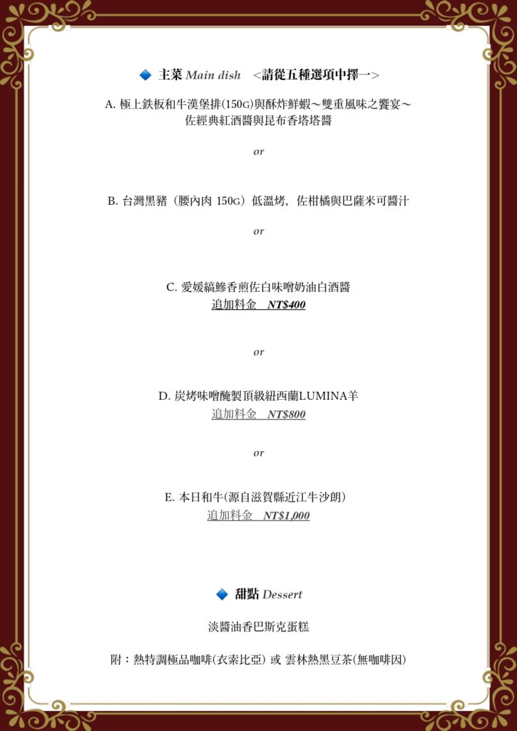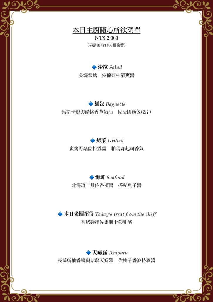 コース料理は、NT$1,600またはNT$2,000に10%のサービス料が別途加算されます。