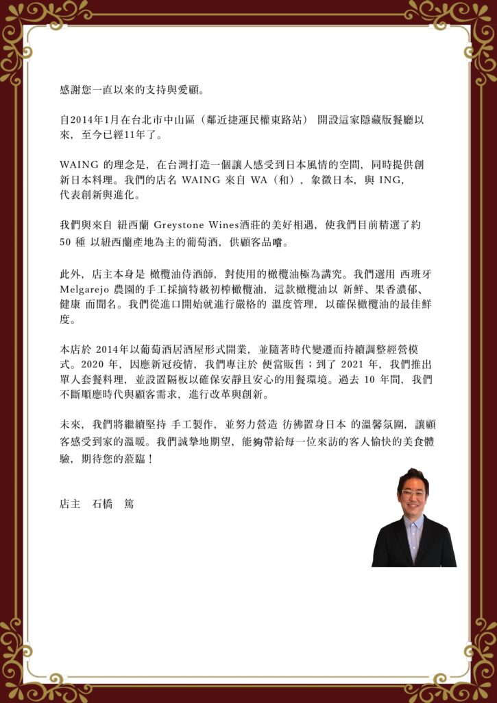 由於我們選用當季新鮮食材,若遇食材供應不足,菜單內容可能會有所調整,敬請見諒。